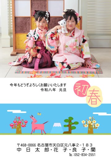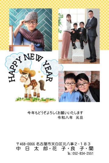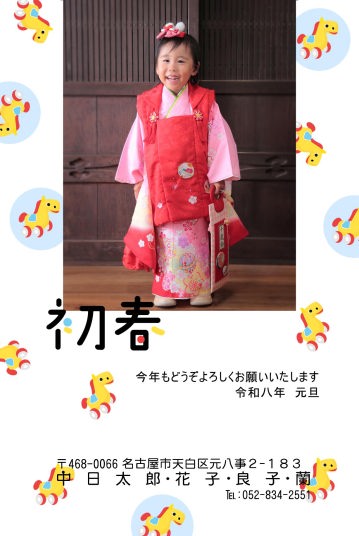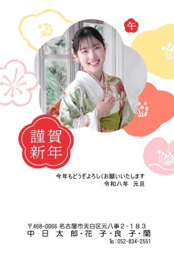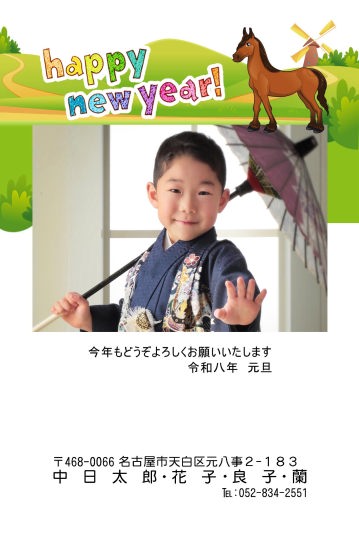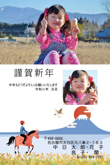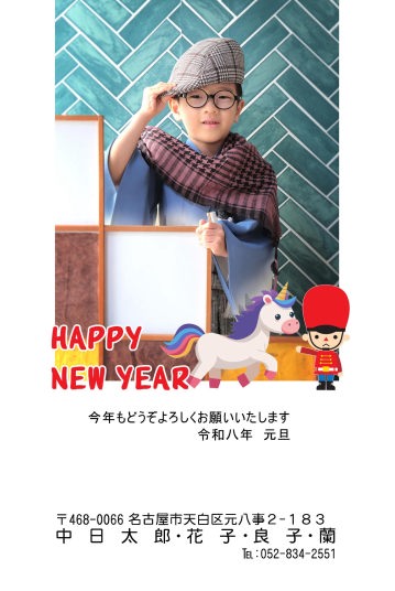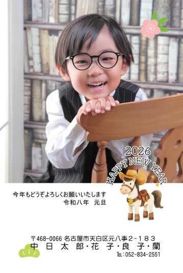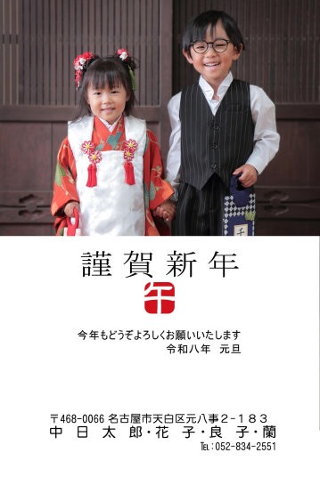 ・写真の入る、定番年賀状、 ・差出人・氏名・住所・お電話番号 e-mailなどが入ります。 ・あいさつ文が選べます。 ・はがき代別途かかります。 ・5枚以上端数OK ・店頭受付の方は年賀ハガキ持込OK ・直接印刷・貼り合わせタイプ選べます |
