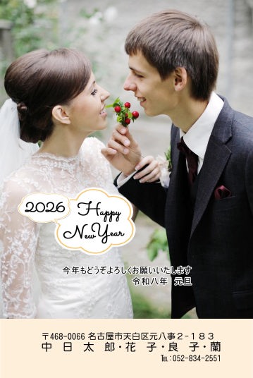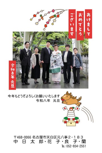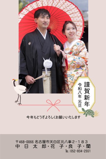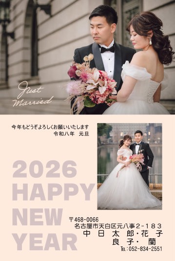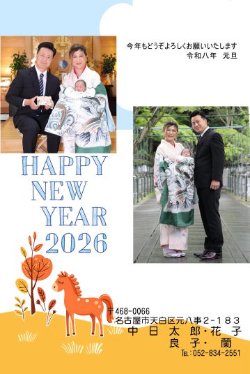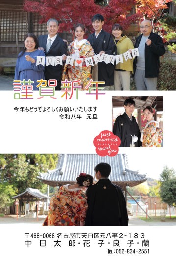 | ⑫ | 結婚して初めてのお正月を迎えています これからは二人で温かい家庭を築いていこうと思います どうぞよろしくお願いいたします 令和8年元旦 |